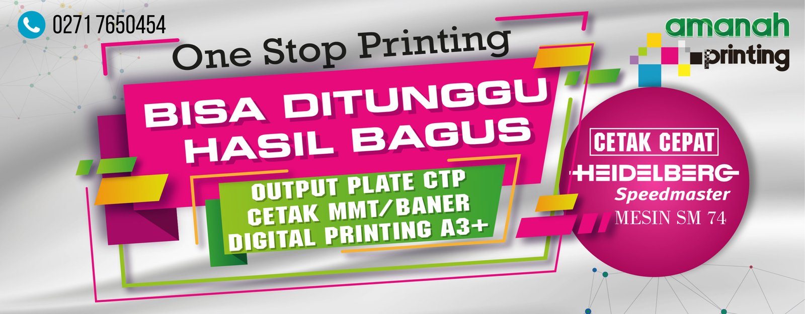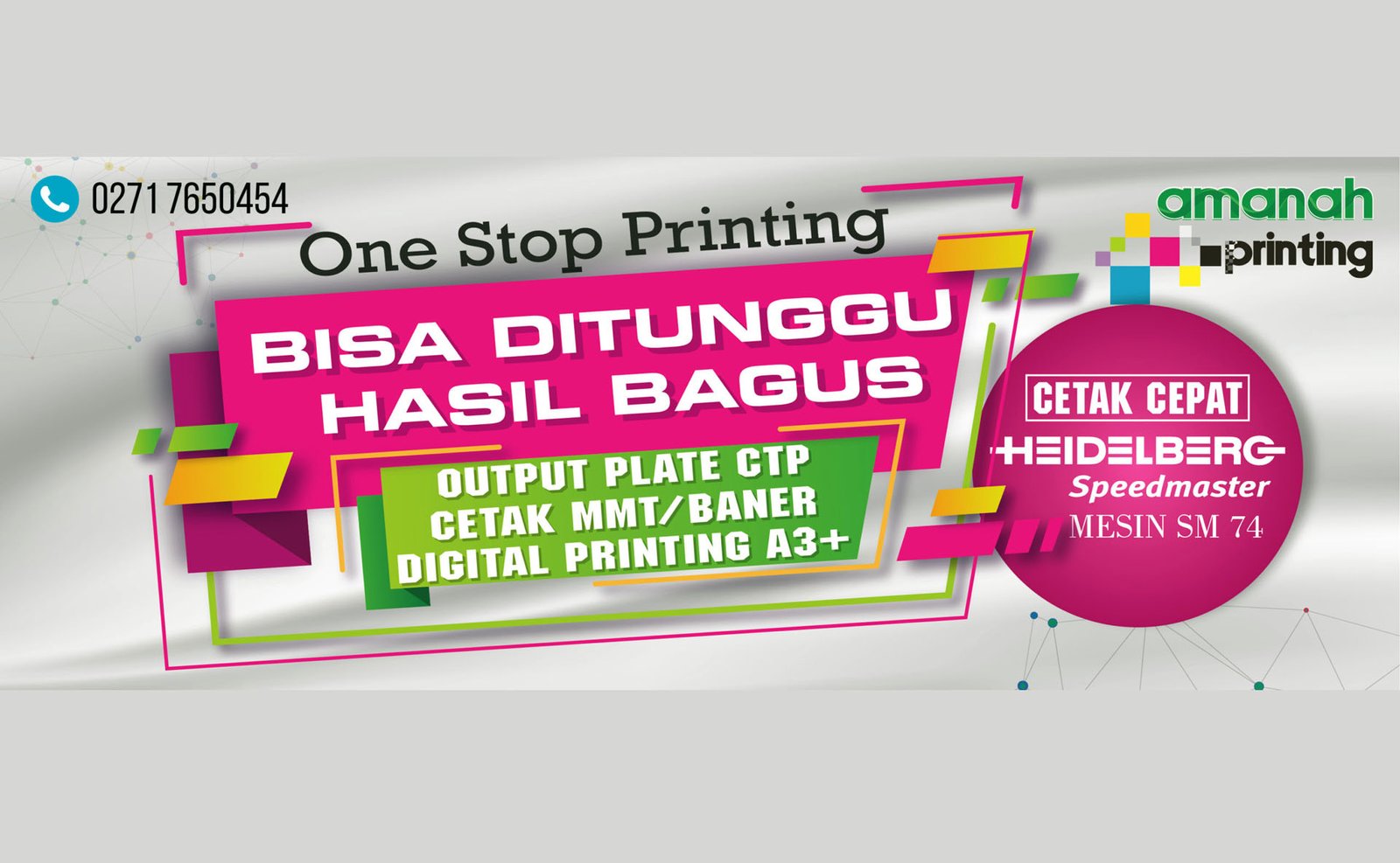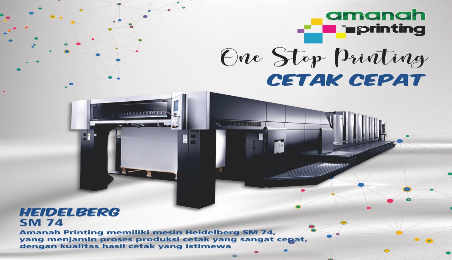 Amanah Printing bergerak dibidang printing yang juga menjadi center cetak CTP (Computer To Plate). berdiri sejak tahun 2011 sehingga telah menjadi spesialisasi CTP. seiring perkembangannya Amanah mengembangkan usahanya menjadi center digital printing, dengan mesin cetak yang canggih, besar dan super cepat sehingga mampu melayani pelanggan dengan hasil yang memuaskan. mesin cetak Heidelberg Speedmaster 52-4P dan Heidelberg Speedmaster 74-4P menjadi andalan untuk memproduksi cetak / printing dengan kulaitas hasil yang cepat dan memuaskan.